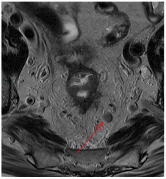 Rectal cancer poses a significant global health burden, and the established treatment approach for patients with locally advanced rectal cancer involves neoadjuvant therapy followed by total mesorectal excision []. This multimodal treatment has led to a reduction in local recurrence rates; however, it has not significantly improved overall survival outcomes [,]. Two recent studies have further highlighted current challenges and evolving strategies in this field. One study demonstrated that a chemoradiotherapy-consolidation chemotherapy protocol can achieve clinical complete response in up to two-thirds of patients, with promising rates of organ preservation in the context of a watch-and-wait approach []. Another comparative study reported similar long-term oncologic and functional outcomes between laparoscopic and robotic intersphincteric resections, reinforcing the role of minimally invasive surgery in low rectal cancer []. The current prognostic stratification relies on the TNM staging system and tumor regression grading. Nevertheless, TNM’s predictive accuracy is limited by patient variability within the same stage, and tumor regression grading is only available postoperatively, limiting its use in preoperative planning []. Therefore, identifying prognostic information from MRI at the time of diagnosis could help optimize treatment and guide patient monitoring from the start. However, to achieve this, a radiology report that is as clear and concise as possible is essential for the multidisciplinary team. Pelvic MRI, indeed, is routinely used as the gold standard for rectal cancer staging, due to its ability to precisely assess possible prognostic indicators, such as extramural vascular invasion and the involvement of the mesorectal fascia [,]. High-quality axial MRI scans offer a detailed view of the anatomical structures surrounding the rectum, including muscles, blood vessels, and lymph nodes (Figure 1).