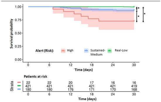 Figure 2. Analysis of 30-day survival comparing different Triage-HF alerts. Alerts are categorized as high risk, sustained medium risk, or low risk based on the criteria described in the text * p < 0.01.