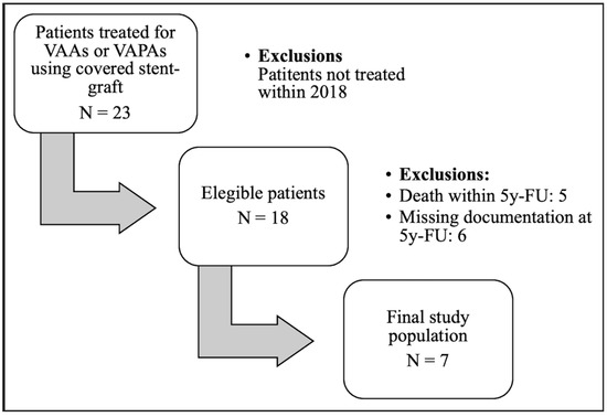 This is a retrospective single-center study including patients who underwent endovascular repair of a VAA or a VAPA with a covered stent graft between 2004 and 2023. However, only patients treated before 2018 were eligible for final analysis to ensure a minimum follow-up of 5 years. Inclusion criteria were the following: (i) treatment of a VAA or a VAPA with endovascular repair, (ii) use of a balloon mounted or self-expandable stent graft without other endovascular tools, and (iii) imaging follow-up with contrast-enhanced CT scan of at least five years. Exclusion criteria were the following: (i) treatment of a VAA or a VAPA with other endovascular tools, and (ii) clinical and imaging follow-up less than five years.