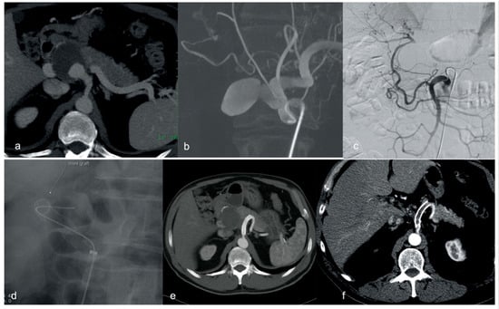 - Venturini, M.; Marra, P.; Colombo, M.; Panzeri, M.; Gusmini, S.; Sallemi, C.; Salvioni, M.; Lanza, C.; Agostini, G.; Balzano, G.; et al. Endovascular Repair of 40 Visceral Artery Aneurysms and Pseudoaneurysms with the Viabahn Stent-Graft: Technical Aspects, Clinical Outcome and Mid-Term Patency. Cardiovasc. Interv. Radiol. 2018, 41, 385–397. [Google Scholar] [CrossRef]