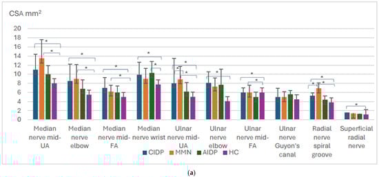 Overview of the significant findings among inflammatory polyneuropathies and healthy controls. Mid—middle, UA—upper arm, FA—forearm. CIDP—chronic inflammatory demyelinating polyneuropathy; MMN—multifocal motor neuropathy, AIDP—acute inflammatory demyelinating polyneuropathy, HCs—healthy controls. Distribution of nerve size according to different polyneuropathy ((a) upper limb, (b) brachial plexus, and vagal nerve, (c) lower limb). Means with standard deviation, p-values for the difference between CSA between different polyneuropathies. * p value < 0.05.