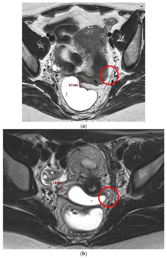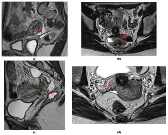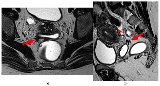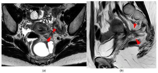 USL involvement is observed in 70% of patients with DIE [12,13], making it the second most frequent site of endometriosis after ovarian involvement [9,14]. On MRI, USL endometriosis typically appears as hypointense nodules on T2WI, or as unilateral or bilateral thickening of these ligaments with regular or irregular margins [13,15]. Lesions are often located near the torus uterinus or along the proximal third of the USL, corresponding to the segment within 2 cm of the torus, which aligns anatomically with the posterior vaginal fornix [16].