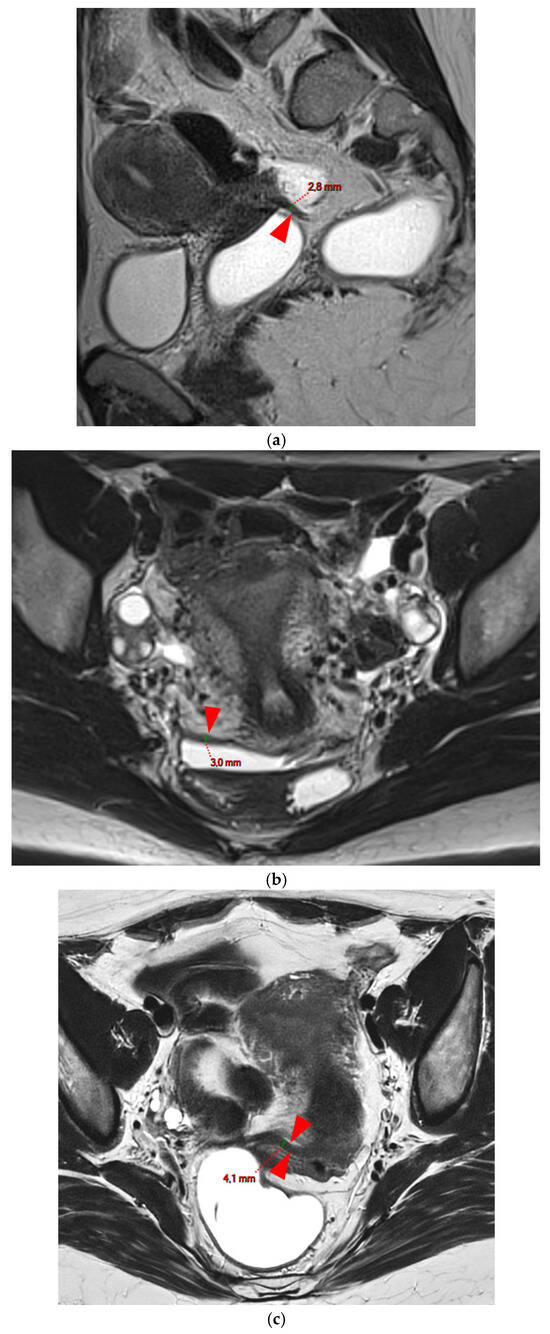 Pelvic MRI scans of three patients with thick (>2 mm), smooth, and regular USLs (HTD type 3A). (a) Sagittal T2WI: a thick (2.8 mm), smooth, tapering-shaped left USL (arrowhead). (b) Axial T2WI: regularly thickened (3 mm) right USL with a smooth surface (arrowhead). (c) Axial T2WI: regularly thickened (4.1 mm) right USL with a smooth surface (arrowheads).
