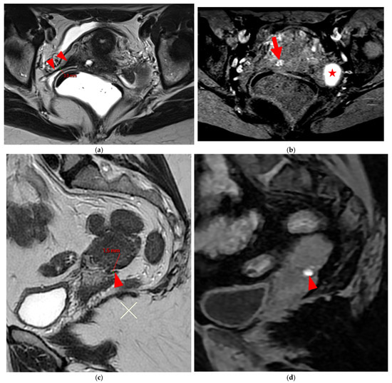 Pelvic MRI scans of two patients with HTD type 4 USLs. (a,b) Patient 1—(a) Axial T2WI: a focally thickened right proximal USL (arrowhead) with caliber disparity, initially classified as a type 3B USL. (b) Axial fat-suppressed T1WI: a hyperintense hemorrhagic spot (arrowhead) within this thickened right proximal USL, ultimately reclassifying it as a type 4 USL. Note the typical hyperintense right ovarian endometrioma (red star). (c,d) Patient 2—(c) Sagittal T2WI: a visible but thin (1.5 mm) left USL (arrowhead), initially classified as a type 2 USL. (d) Sagittal fat-suppressed T1WI: a hyperintense hemorrhagic spot (arrowhead) at the origin of this USL, ultimately reclassifying it as a type 4 USL.