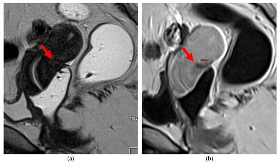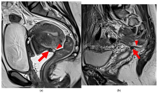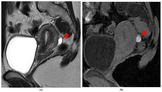 Pelvic MRI scan of a symptomatic patient with a retroflexed uterus. (a) Sagittal T2WI shows a uterus in a retroverted/retroflexed position, resulting in an unassessable torus uterinus area (arrow). (b) Sagittal contrast-enhanced T1WI without fat suppression highlights the thickened torus and the origins of the USLs, making them visible and measurable (arrow) with a thickness >2 mm.