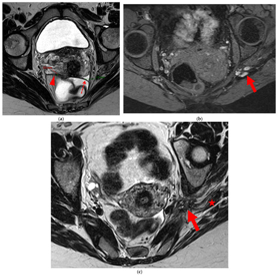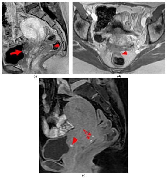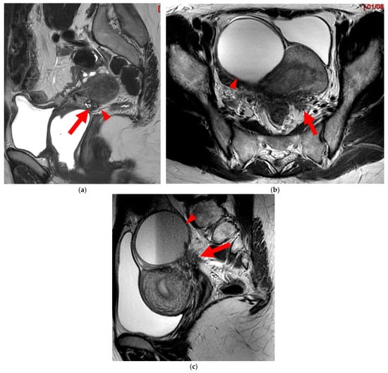 Pelvic MRI scan of a patient with a “kissing ovaries” sign and rectal involvement (i.e., HTD type 6 USLs). (a,b) Axial T2WI (a) and contrast-enhanced T1WI (b) show both ovaries in close proximity (“kissing ovaries” sign) (arrowheads) and rectosigmoid wall infiltration (arrows). (c) Sagittal contrast-enhanced T1WI shows rectosigmoid wall infiltration, appearing as a “medallion-shaped” lesion outlined by markedly enhancing mucosa (arrowhead).