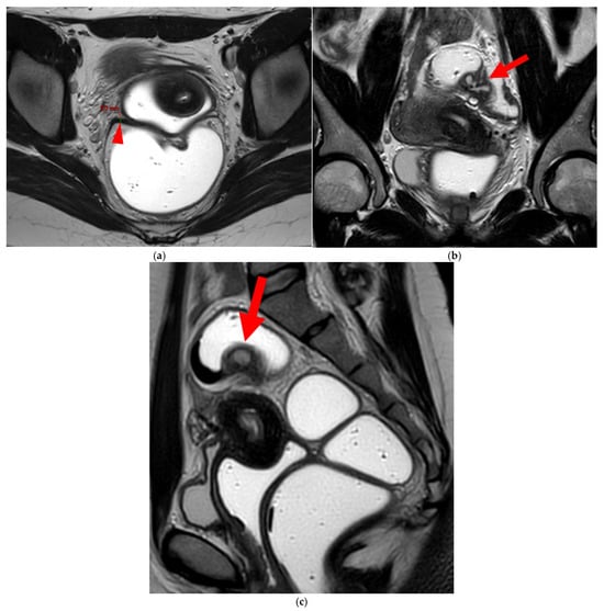 Pelvic MRI scan of a patient with HTD type 6 USLs. (a) Axial T2WI shows a thick (3 mm) right USL (arrowhead) with regular margins, initially classified as a type 3A USL; the left USL is not visible (type 1). (b,c) Coronal (b) and sagittal (c) T2WI show sigmoid colon wall infiltration appearing as a “medallion-shaped” lesion (arrows). The presence of “visceral” involvement of the digestive tract leads to the reclassification of these USLs as type 6.