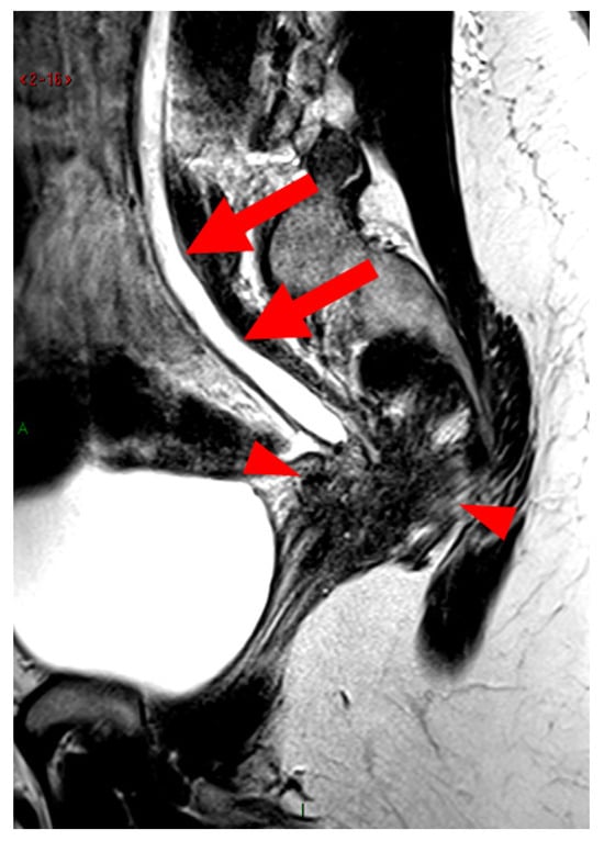 Pelvic MRI scan of a patient with HTD type 6 USLs. Sagittal T2WI demonstrates nodulospicular infiltration of the sacro-recto-genital septum, with the endometriotic lesion delineating the structure of the inferior hypogastric plexus (arrowheads). Note that the lesion also involves the distal ureter, causing upstream ureteral dilation (arrows).