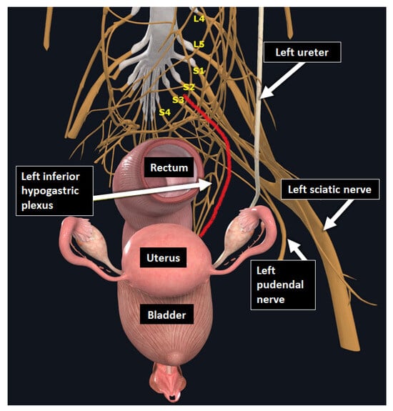 Endometriosis is classified into three phenotypes based on the location of ectopic endometrial-like tissue: peritoneal (i.e., superficial), ovarian (i.e., endometrioma), and deep infiltrating endometriosis (DIE), which is defined as lesions penetrating 5 mm or more beneath the peritoneal surface [4,5]. DIE primarily affects the uterosacral ligaments (USLs), torus uterinus, rectum, rectosigmoid junction, bladder, ureters (potentially causing upstream hydronephrosis), and the sacro-recto-genital septum (a.k.a. Delbet sagittal fascia), which encloses the inferior hypogastric plexus [6].