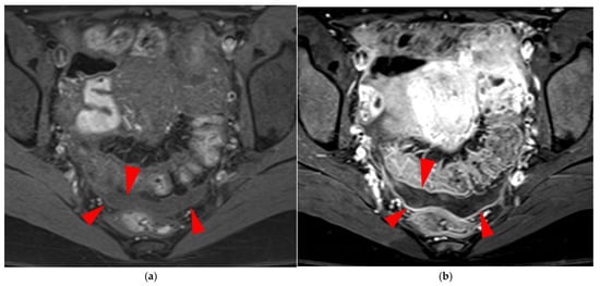 - Hottat, N.; Larrousse, C.; Anaf, V.; Noël, J.C.; Matos, C.; Absil, J.; Metens, T. Endometriosis: Contribution of 3.0-T pelvic MR imaging in preoperative assessment--initial results. Radiology 2009, 253, 126–134. [Google Scholar] [CrossRef]