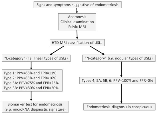 Furthermore, the HTD MRI classification could form the foundation for developing artificial intelligence algorithms to enable automated diagnosis in radiology practices. The quantified diagnostic suspicion of endometriosis, based on the PPV associated with each USL MRI type, could also be corroborated through biomarker assessments, such as salivary microRNA signatures. This biological confirmation is particularly relevant for linear USL types, where the MRI PPV is below 100%, and the FPR remains relatively high.