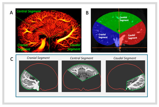 To directly compare two-dimensional (2D) SRUS and three-dimensional (3D) μCT modalities, the same kidney region imaged by 2D SRUS within the 3D μCT volume was identified and isolated. The software ITK-SNAP Version 4.0.1 was utilised [25], allowing a visual overlay of the 2D SRUS image within the 3D μCT volume. Co-registration between 2D SRUS and 3D μCT was achieved by manipulating the SRUS image with translation, rotation, and scaling. Initially, the intention was to manually co-register the complete 2D SRUS image to the closest matching μCT plane using ITK-SNAP; however, due to differences in the scanning plane of the two modalities, full alignment of the SRUS image was not possible [25]. Three co-registrations were created per kidney to overcome this, focusing on smaller anatomical segments: the cranial, central, and caudal segments (Figure 1A). Co-registration of smaller regions enabled the highest degree of co-registration agreement between 2D SRUS and 3D μCT. This process also enabled us to overcome some of the distortions in anatomical accuracy introduced during both the preparation of the kidney for µCT and the SRUS reconstruction.