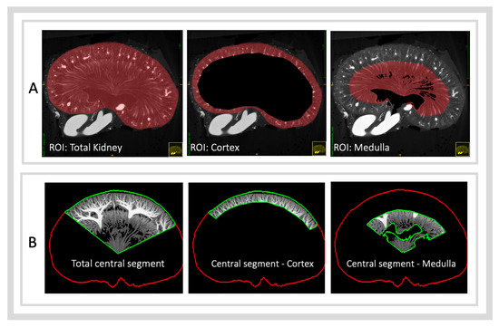 - ROI—Medulla: Created by subtracting the pelvic mask from the vasa recta boundary mask.