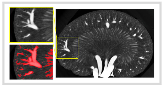 After the SRUS data acquisition, the left kidneys were infused with the contrast agent Microfil (MV122, Flow Tech Inc., Carver, MA, USA), excised, and scanned ex vivo for 11 h in a ZEISS XRadia 410 Versa µCT scanner (Carl Zeiss Microscopy GmbH, Jena, Germany) with an isotropic voxel size ranging from 22.6 µm to 26.5 µm. The full details of the µCT scans and preparation of the kidneys, including euthanasia of the rats, are presented in Søgaard et al., 2023 [23].