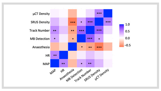 A correlation matrix was used to characterise the inter-dependent relationships between independent experimental factors (blood pressure, heart rate and anaesthesia time) and the SRUS and µCT quantitative parameters: MB detection rate, the number of reconstructed tracks, and density measurements (Figure 4).