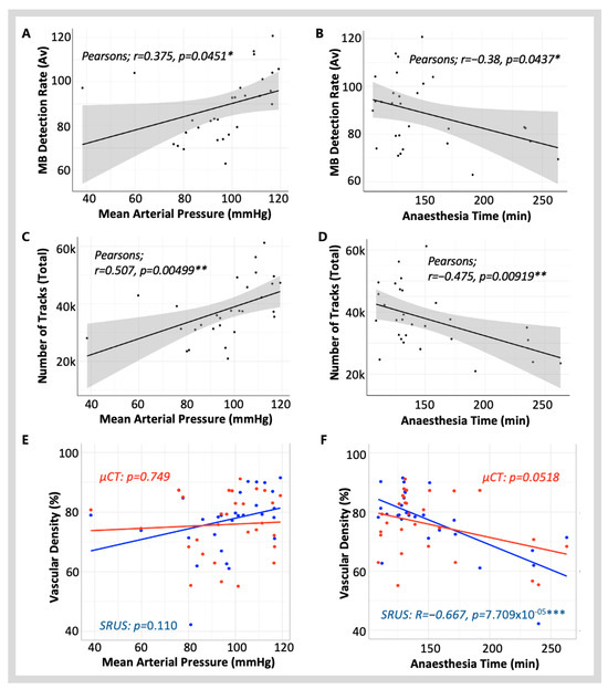 Due to experimental factors, the time the animal spent under anaesthesia before SRUS scanning varied between 109 min and 263 min. This introduced variation in the time of isoflurane exposure and length of surgery. The length of anaesthesia before scanning had a significant linear correlation to the MB detection rate (Pearson’s; r = −0.38, p = 0.0437 *) (Figure 5B), the number of MB tracks (Pearson’s; r = −0.475, p = 0.00919 **) (Figure 5D) and the SRUS vascular density measurements (Pearson’s; r = −0.667, p = 7.709 × 10−5 ***), with longer anaesthesia times causing a significantly lower measured SRUS vascular density. No statistically significant linear relationship existed between anaesthesia time and vascular density when measured from µCT (p = 0.0518) (Figure 5F).