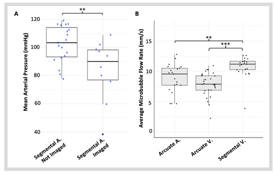 An ANOVA was used to analyse the MB flow velocity between the three other vessel types. The vessel type had a significant association with MB velocities (F(2,76) = 18.2, p = 3.48 × 10−7 ***), and the pattern between vessel types did not match the biologically expected pattern of faster velocity in the arterial system (Figure 6B). The average MB flow velocity was fastest in the large segmental vein and significantly faster than those detected in the arcuate arteries (p = 0.0010 **) and the arcuate veins (p = 2.00 × 10−7 ***). A linear correlation analysis identified how the MAP affected the MB flow velocity in these different vessels. The MAP had a significant linear correlation with the MB flow velocities in both the segmental veins (Pearson’s; r = 0.458, p = 0.0125 *) and arcuate veins (Pearson’s; r = 0.579, p = 9.93 × 10−4 ***) but not in the arcuate arteries (p = 0.540).