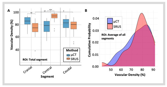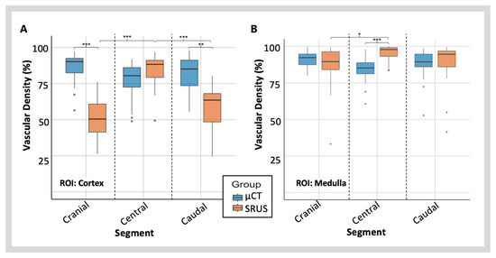 A comparison between in vivo SRUS and ex vivo µCT regional vascular density measurements for (A) the cortex and (B) the medulla. The significance values displayed represent pairwise comparisons from a two-way repeated-measures ANOVA, which compares SRUS regions to each other and matched segment data from SRUS and µCT. The appropriate asterisks show the p-value, one asterisk (*) for p < 0.05, two asterisks (**) for p < 0.01, and three asterisks (***) for p < 0.001.