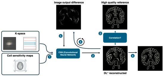 K-space data and coil sensitivity maps are input into a convolutional neural network (CNN). The CNN reconstructs an image, which is then compared to a high-quality reference. The resulting error (image output difference) is iteratively fed back into the network to refine the reconstruction. After training converges, a final image is produced with fixed model parameters [5,6,7]. * Deep Learning.
