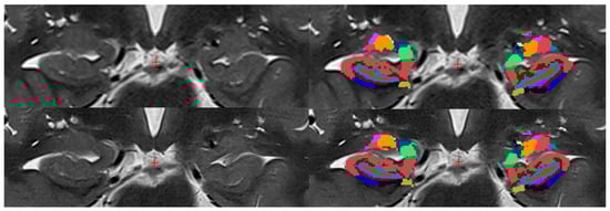 Using FreeSurfer (version 7.4.1; Laboratories for Computational Neuroimaging, Athinoula A. Martinos Center for Biomedical Imaging, Charlestown, MA, USA), a segmentation of hippocampal subregions and combined labels was performed (Figure 2 and Figure 3) [16,17]. To ensure accuracy, three radiologists manually reviewed the automated segmentations for potential errors, thereby verifying consistency and reliability. Segmented volumes were compared between hippocampal regions delineated using conventional T2 TSE 2D and T2 TSE 2D DRB sequences, thus facilitating an objective evaluation. Both conventional T2 TSE and T2 TSE DRB images were co-registered with T1-weighted 3D MPRAGE images, which served as the anatomical reference and were employed for whole-brain segmentation (3D sequence), a requisite preliminary step prior to individual hippocampal region segmentation. Importantly, the segmentation of hippocampal subfields was exclusively based on T2-weighted imaging data. Additionally, given that the MPRAGE sequence is widely utilized in brain imaging for its superior delineation of white and gray matter and its well-established characteristics in brain region segmentation, it also served as a reference standard to verify the accuracy of the segmentation process.