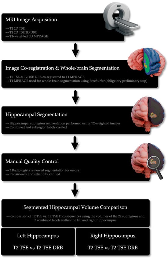 Overview of the workflow for hippocampal subregion segmentation and analysis using FreeSurfer. The process includes MRI acquisition, image co-registration, segmentation, manual quality control, and volume comparison between T2 TSE and T2 TSE DRB sequences using the volumes of hippocampal segments.