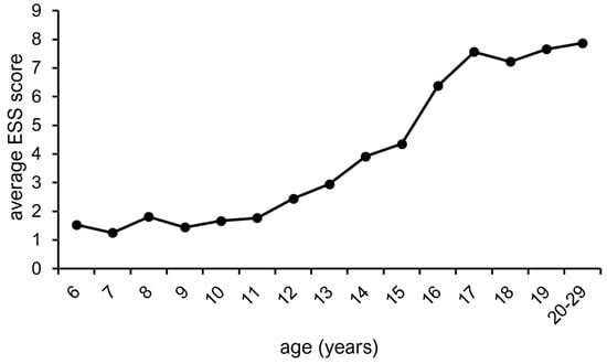 In total, 556 patients were included (males, n = 215 [38.7%]; females, n = 341 [61.3%]). The mean age was 14.1 ± 6.1 years, and 238 (42.8%) patients were ≤11 years old, 155 (27.9%) were 12–17 years old, and 163 (29.3%) were ≥18 years old. The data distribution of the ESS scores of the samples is shown in Figure 1. The histograms did not show a normal distribution. The skewness and kurtosis were 1.2 and 0.8, respectively, and no outliers were observed. The most frequent ESS score was 0 (n = 111), and the highest ESS score was 19. The frequency gradually decreased as the score increased. The median ESS score was 3, and the mean ESS score was 4.1 ± 4.1. The mean ESS scores increased significantly with age (Figure 2). From 6 to 11 years of age, the mean ESS score remained at <2. However, the ESS score began to increase gradually from age 12 onward, with the largest increase in the mean score (i.e., 2) occurring between ages 15 and 16 years. At the age of 17 years, the mean score exceeded 7, with no remarkable increase in the score at older ages.