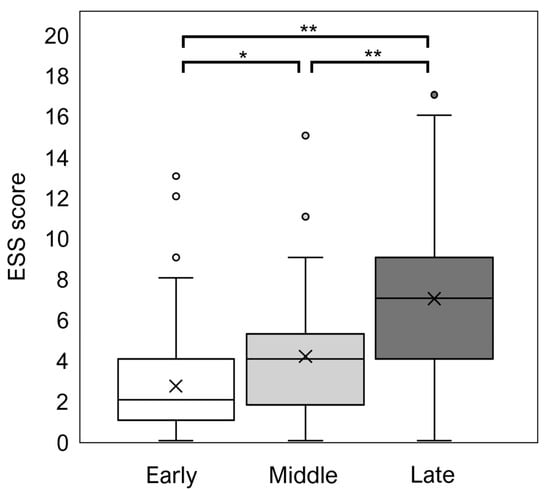Comparison of ESS scores at early (12–13 years), middle (14–15 years), and late (16–17 years) stages of adolescence. Boxes represent interquartile ranges (IQRs), horizontal lines in boxes represent median values, whiskers represent minimum and maximum values, ✕ represents the mean value, and dots represent outliers. * p < 0.05; ** p < 0.01 (Steel–Dwass test).