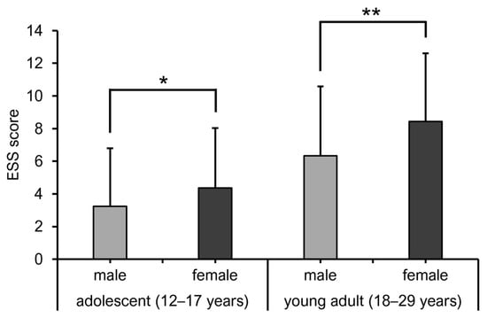 Comparison of ESS scores of males and females. * p < 0.05; ** p < 0.01 (Mann–Whitney U test).