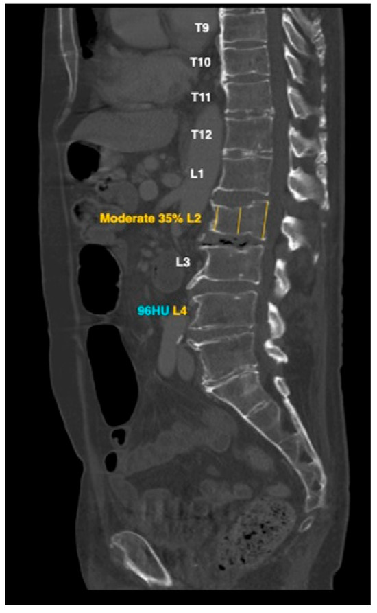AI-based L2 vertebral compression fracture calculation and attenuation value of L4 low bone density: representative example.