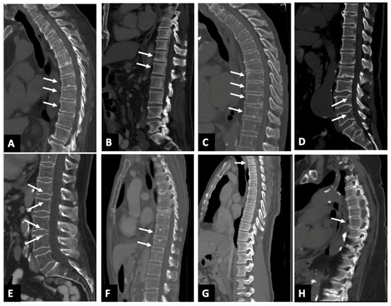 Sagittal CT images (A–H) in 8 different patients with AI software calling false positive fracture. (A) the white arrows show osteoarthritic wedging deformity involving vertebral bodies T8–10; (B) the white arrows show physiological wedging deformity involving vertebral bodies T12–L1; (C) the white arrows show endplate irregularities denoting Scheuermann’s disease, noted in multiple lower thoracic vertebral bodies, namely T8–11; (D) the white arrow shows cupids bow deformity noted in lumbar vertebral bodies L4–L5; (E) the white arrows show concavity/ballooned disk spaces noted in lumbar vertebral bodies L1–L4; (F) the white arrows show Schmorl’s node involving vertebral bodies T11–12. Fractures of T7 and T9 vertebral bodies were accurately identified; (G) the white arrows show edge of field of view overcalls involving the T1 vertebral body that appears normal; (H) the white arrows show T6 fracture overcall in a patient with scoliosis.