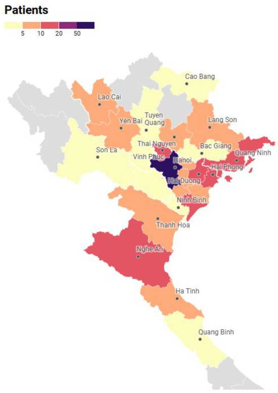 A total of 201 children diagnosed with CAH were included in the study. The median age at valuation was 9.8 years, ranging from 1.1 to 16.5 years. Participants originated from 25 provinces across the northern and central regions of Vietnam (Figure 1). The geographic distribution analysis indicated regional variations in the number of reported CAH cases, with higher concentrations observed in certain provinces.