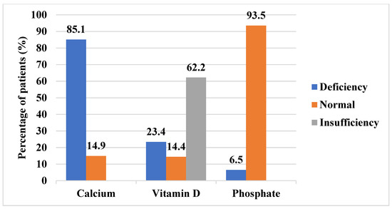 Anthropometric measurements revealed that the median height standard deviation score (SDS) was −0.7 (range: −4.0 to 4.3), and the median body mass index (BMI) SDS was 1.4 (range: −2.7 to 5.2). The median difference between bone age and chronological age (BA-CA) was 1.4 years (range: −8.3 to 8.6), indicating a general trend toward advanced skeletal maturation. Among the 201 patients, 51.7% had an advanced bone age (BA > CA), 38.3% had an age-appropriate bone age (BA = CA), and 10.0% had a delayed bone age (BA < CA). In terms of BMI, 1.5% were classified as thin, 45.3% had normal weight, 24.4% were overweight, and 28.9% were obese. Regarding height-for-age, 4.5% had severe stunting, 11.9% had moderate stunting, and 83.6% had normal stature. Vitamin D insufficiency or deficiency was observed in 85.6% of the sample, while 85.1% exhibited calcium deficiency. Among the 138 patients with available phosphate data, 6.5% were found to have phosphate deficiency (Figure 2). The baseline sociodemographic, clinical, biochemical, and anthropometric characteristics of the study population are presented in Table 1.