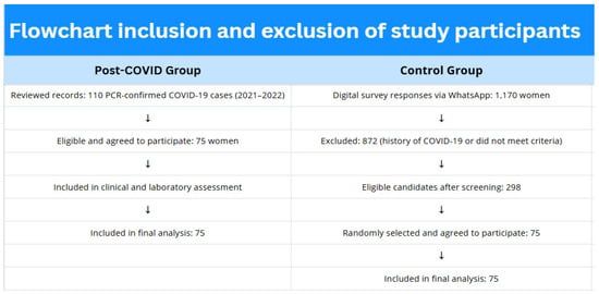 Control group: A digital questionnaire was distributed via WhatsApp Messenger, yielding 1170 responses. After excluding individuals who reported a history of COVID-19, we randomly selected 75 women who met the inclusion criteria (18–45 years old, no chronic diseases, living in Almaty, and signed informed consent).