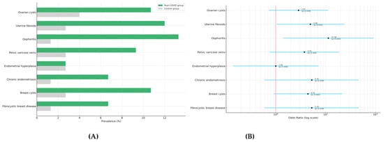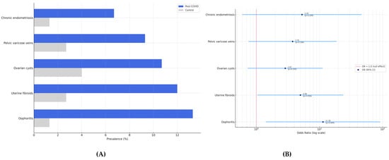 (A) Prevalence of pelvic and breast structural abnormalities in post-COVID-19 and control groups. (B) Odds ratios with 95% confidence intervals for the same conditions.