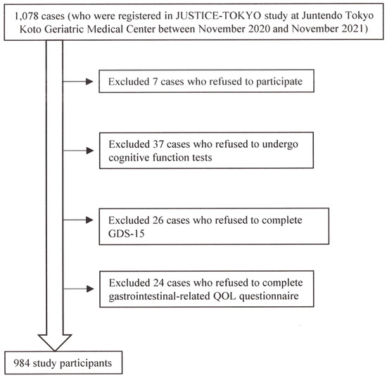 Of the 1078 cases who were registered in the JUSTICE-TOKYO study at Juntendo Tokyo Koto Geriatric Medical Center between November 2020 and November 2021, 984 participants were eligible.