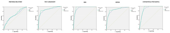 Receiver operating characteristic (ROC) analysis for preterm delivery, NICU hospitalization, RDS, sepsis, and congenital pneumonia.