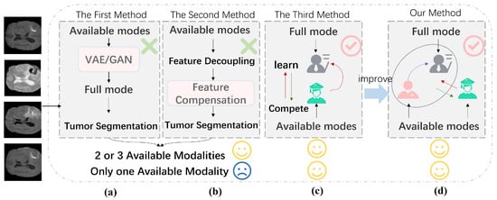 As shown in Figure 1, the first method generates the missing modality from the available modalities [8,9]. The second method extracts features from the available modalities, maps them into a learnable latent space, and combines them using fusion techniques [10,11,12,13,14]. However, due to the limited features of a single modality, unsatisfactory results are often produced by these two methods. The above two methods aim to transfer information from the accessible modalities to the missing modality. This concept of knowledge transfer inspires us to apply knowledge distillation methods to address the brain tumor segmentation problem with a single modality.