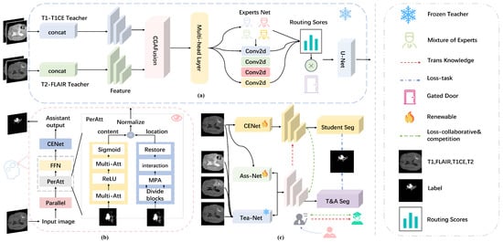 The complete flow chart of this study. (a) shows the CGAMHMoE-UNet teacher model, with T1-T1CE and T2-FLAIR inputs. Features are fused by CGAFUSION, enhanced by MHMOE, and segmented by UNet. (b) shows that the assistant model consists of two parallel branches, MHA and MPA, with CENet as the encoding and solver for the helper model segmentation. (c) shows the network architecture. The parameters of the teacher model are frozen after training. The segmentation results of teacher model and assistant model are weighted and added to obtain the output of teacher–assistant network. The student model is segmented by CENet code and solver. In the process of knowledge distillation, the student model and the teacher–assistant network model both learn and compete to obtain the final segmentation results.