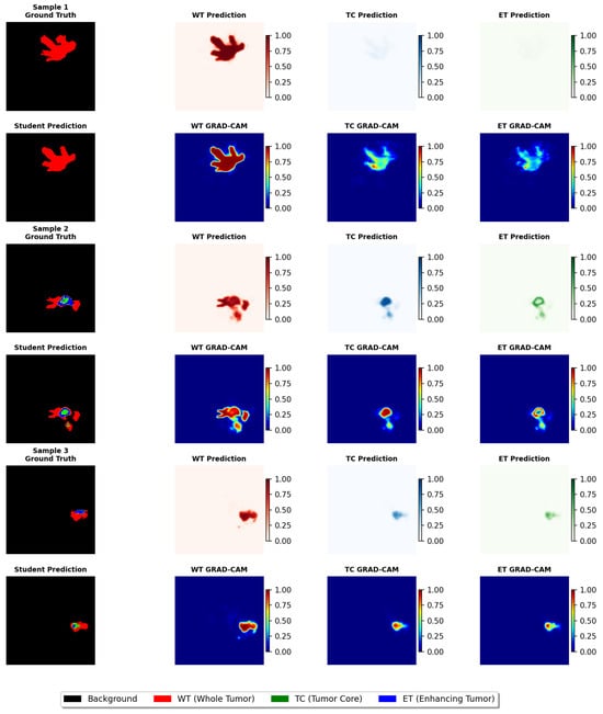 Based on Table 1 and Table 2, we observe that the student model still has room for improvement in the T2 modality. To better understand the features and shapes, the model focuses on for different categories of images, Grad-CAM (Gradient-weighted Class Activation Mapping) heatmaps were used to highlight the regions of interest during prediction. Figure 4 presents the GRAD-CAM visualization analysis results of the student network within the TASCCNet framework conducted for model interpretability studies in brain tumor segmentation tasks. Figure 4 contains three sample cases, with each sample occupying two rows: the first row displays the ground truth annotations and prediction results for three tumor subregions, including the whole tumor (WT, red), tumor core (TC, green), and enhancing tumor (ET, blue). It should be noted that to better highlight the regions of model interest, a more vivid color mapping is employed compared to Figure 5, resulting in different color schemes between these two figures. The second row presents the student network’s comprehensive prediction results and corresponding GRAD-CAM heatmaps, where warm colors (red/yellow) indicate regions with high model attention, and cool colors (blue) represent areas with lower activation levels. Through analysis of these heatmaps, we can validate whether the model focuses on tumor-relevant anatomical structures. As shown in Figure 4, the student model effectively distinguishes the tumor from the background. However, it fails to accurately identify the peritumoral edema and enhancing tumor regions. Figure 5e–h display the segmentation results of the student network and further support this conclusion.