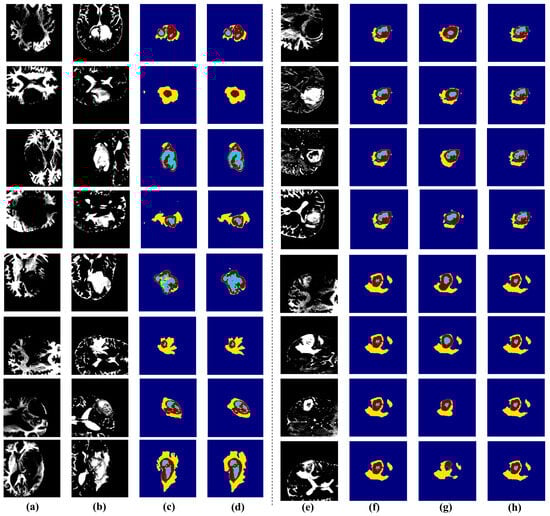 Figure 5 shows the segmentation results of the teacher network and student network. In the teacher network (a–d in Figure 5), the features from the four modalities—T1, T1ce, T2, and Flair—are fused and enhanced by the MHMoE, allowing the teacher model to effectively utilize the complementary characteristics of each modality. This maximizes its ability to capture various anatomical structures and pathological regions of the tumor. The integration and enhancement of these multimodal features enable the teacher model to overcome the limitations of single-modality input, achieving comprehensive tumor region segmentation with greater robustness and precision.