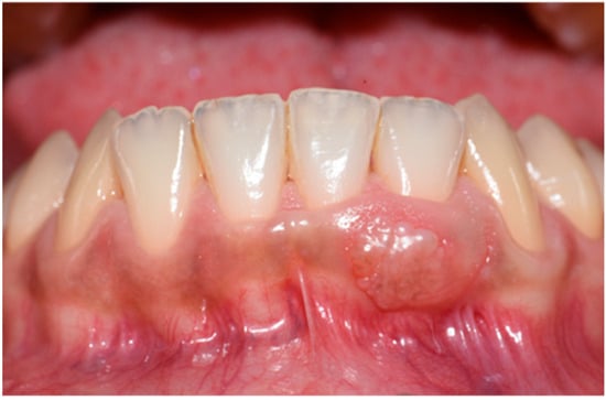 A 27-year-old female was referred to the Unit of Dentistry and Oral Surgery at the University Hospital of Pisa for the evaluation of an exophytic mass located in the anterior mandibular gingival region. Her medical history was unremarkable, with no known systemic conditions, no ongoing pharmacological therapies, and no history of tobacco use. The patient reported that the lesion had been present for approximately three months, exhibiting a progressive increase in size without episodes of regression, exacerbation, pain, or bleeding. She also denied any history of trauma to the affected area.