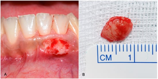 - Decani, S.; Quatrale, M.; Caria, V.; Moneghini, L.; Varoni, E.M. Peripheral Ameloblastoma: A Case Report and Review of Literature. J. Clin. Med. 2024, 13, 6714. [Google Scholar] [CrossRef]