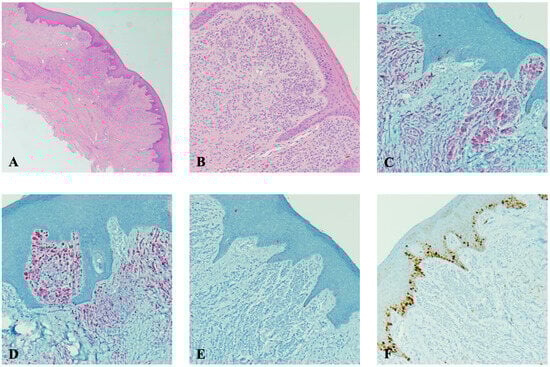 The amelanotic melanocytic nevus of the oral mucosa at low (A) and high (B) magnification. No significant deposition of melanin is detected by histology, showing the well-differentiated sub-epithelial melanocytic proliferation with no mitotic figure. By immunohistochemistry, the nevus shows MART1 (C) and p16 (D) positivity with no immunoreactivity for HMB45 (E) or proliferating index Ki67 (F), with such an immunostaining pattern confirming the benign nature of the melanocytic neoformation. (A,B): Hematoxylin and eosin histochemical staining; original magnification: 2× (A) and 10× (B). (C–F): Immunoperoxidase stainings with hematoxylin counterstaining; original magnification: 10×.