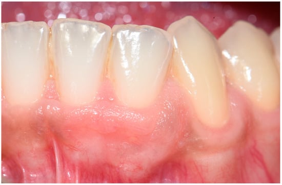 Clinical appearance of the gingival lesion. An exophytic mass of the attached gingiva can be observed at the level of teeth 3.1–3.2. The lesion presents with an oval shape and lobulated surface.