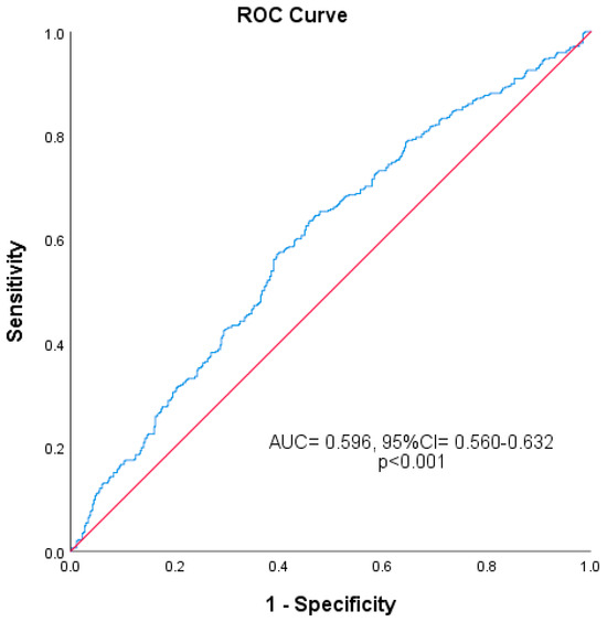 For Groups I and II, an SII value of 627.9 was found to differentiate severe OA from mild to moderate OA with a sensitivity of 42.5% and specificity of 70.6%. The plotted ROC curve is shown in Figure 1 (AUC: 0.596; 95% CI: 0.560–0.632). In ROC analysis, 0.596 was found to be well below the clinically useful level. Although this decrease in sensitivity and specificity is significant, the main model performance fit is low. When 946 patients were divided into two groups according to the threshold SII value of 627.9, 603 patients had SII values < 627.9, while 343 patients had SII values > 627.9. The severity of osteoarthritis was significantly different between these two groups (Table 2).