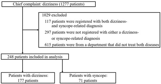 We identified 1277 patients with dizziness as the chief complaint during the study period. Of these, 1029 met the exclusion criteria and 248 patients were included in the analysis (Figure 1). A total of 177 patients were diagnosed as related to vertigo, and 71 were diagnosed as related to syncope. The prior probability of a diagnosis of dizziness-related conditions was 71.3%. The analysis extracted 48 terms in three steps (Table 1).