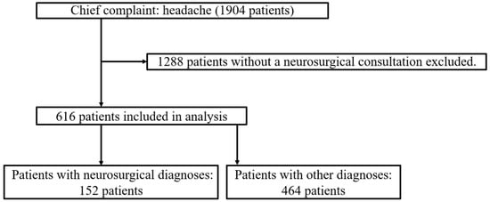 The second cohort comprised patients whose initial EMRs listed headaches as the chief complaint. The outcome was defined as the registration of neurosurgical diagnoses, including subarachnoid haemorrhage, cerebral haemorrhage, cerebral infarction, and brain tumour. As the outcome was the registration of neurosurgical diagnoses, patients without a neurosurgical consultation were excluded.