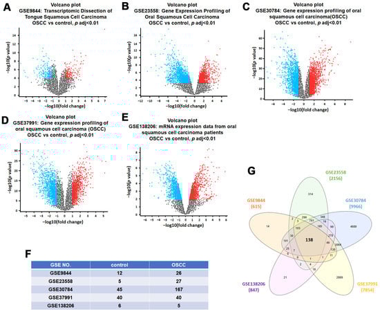 Identification of common differentially expressed genes (DEGs) in OSCC datasets. (A–E) Volcano plots showing upregulated (red), downregulated (blue), and non-significant (black) genes in five GEO datasets: GSE9844, GSE23558, GSE30784, GSE37991, and GSE138206. Adjusted p-value < 0.01 and |log2 fold change| > 1 were considered significantly differentially expressed. (F) Summary of sample size for each dataset. (G) Venn diagram illustrating common DEGs consistently altered across all five datasets.