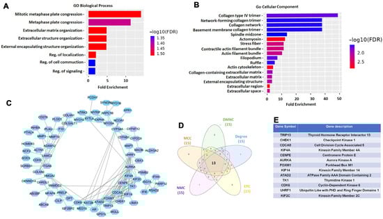 Functional enrichment and hub gene identification. (A) Gene Ontology (GO) analysis showing enrichment of biological processes among 138 DEGs. (B) Cellular component enrichment analysis among 138 DEGs. (C) Protein–protein interaction (PPI) network generated from STRING database and analyzed with MCODE in Cytoscape. (D) Venn diagram showing 13 common hub genes identified by five topological algorithms (Degree, EPC, MNC, DMNC, MCC) using CytoHubba. (E) List of hub genes.