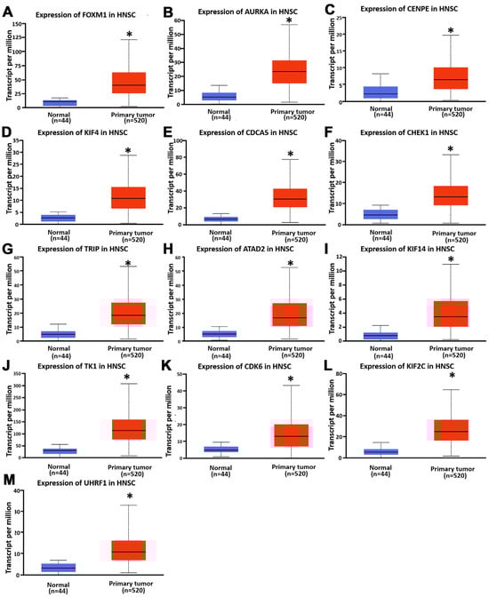 (A–M) Expression analysis of hub genes in HNSC. TCGA analysis showing mRNA expression of 13 hub genes in HNSC compared to normal tissues. * p < 0.05 compared to normal tissues.